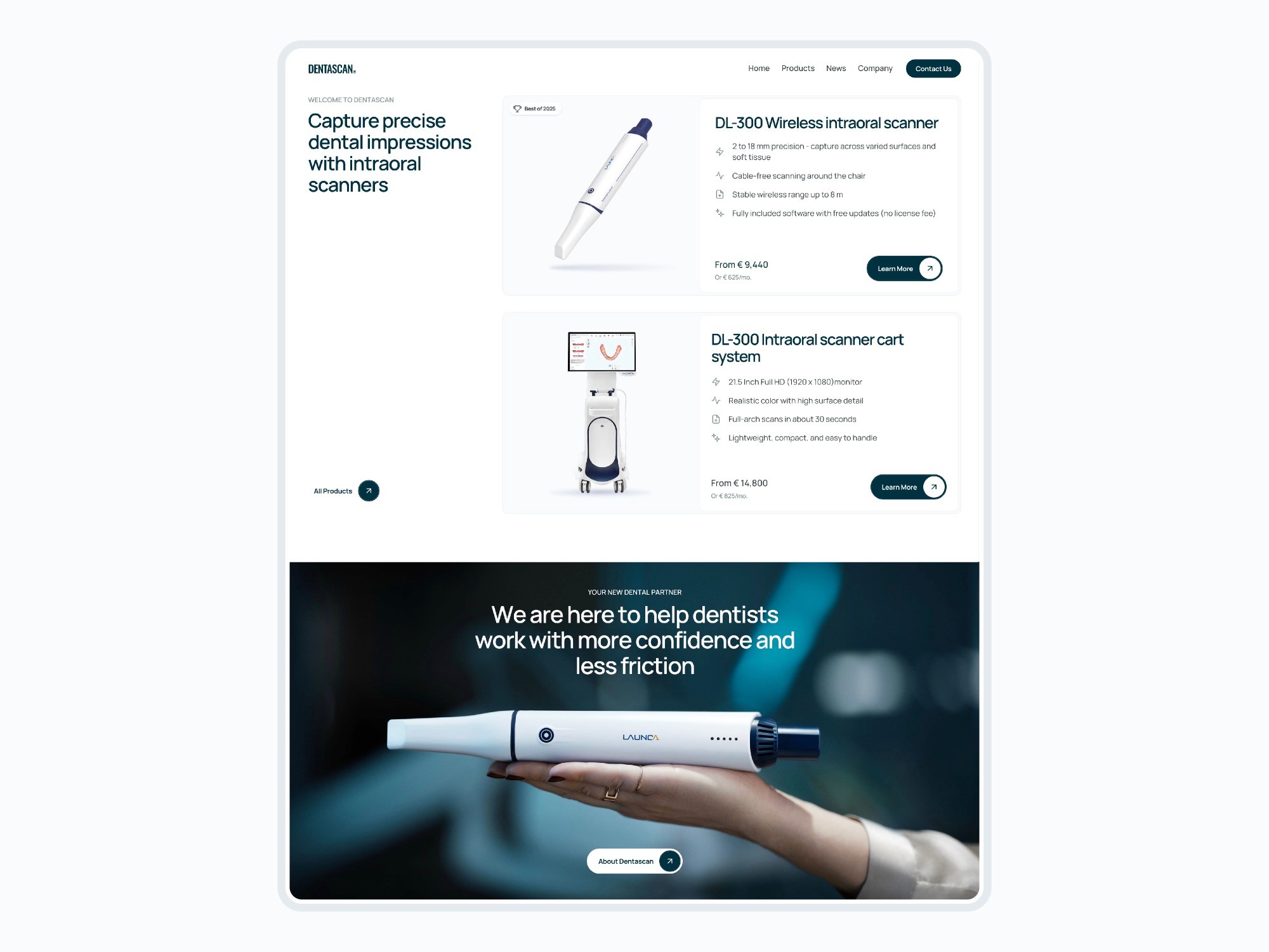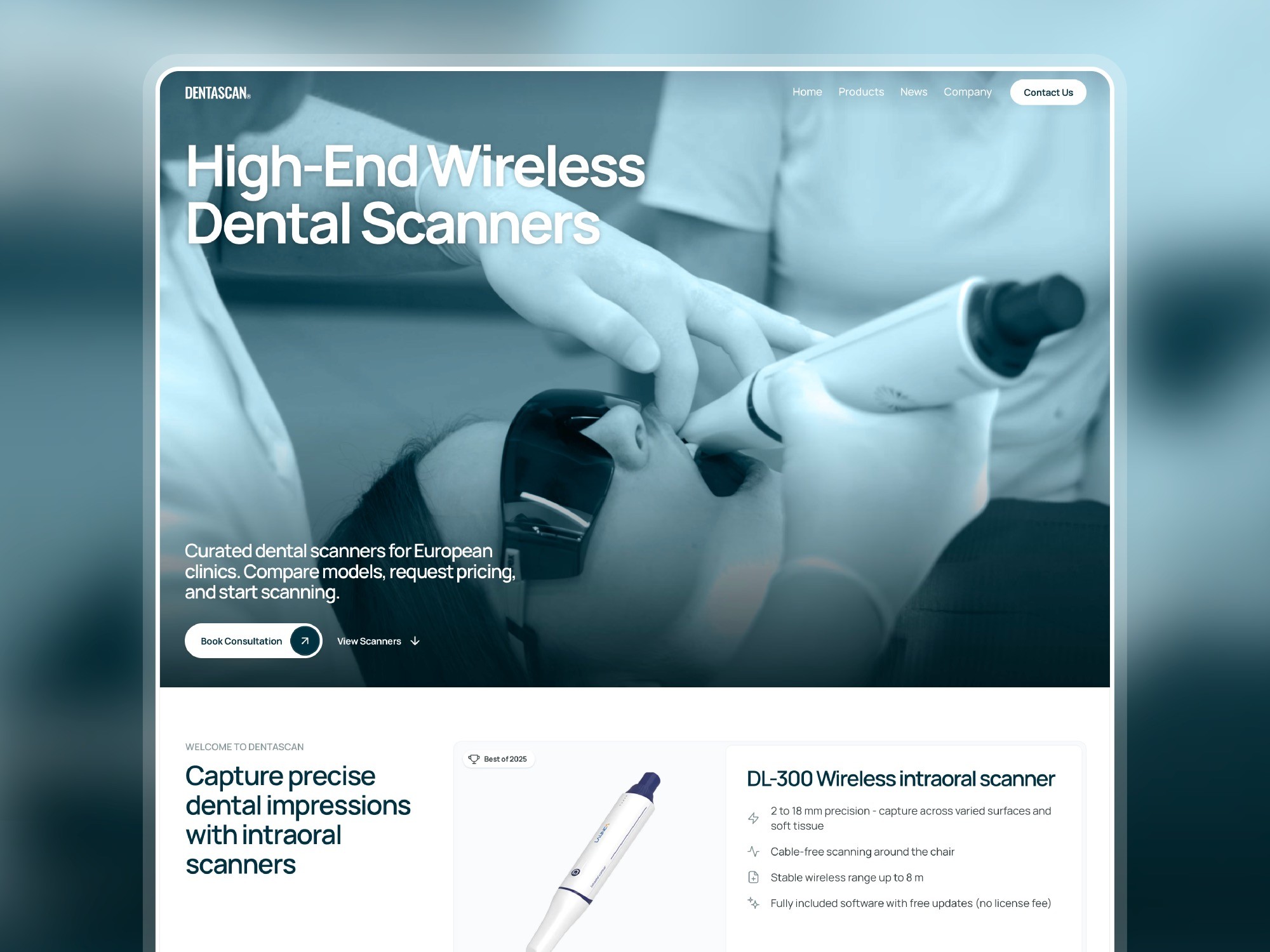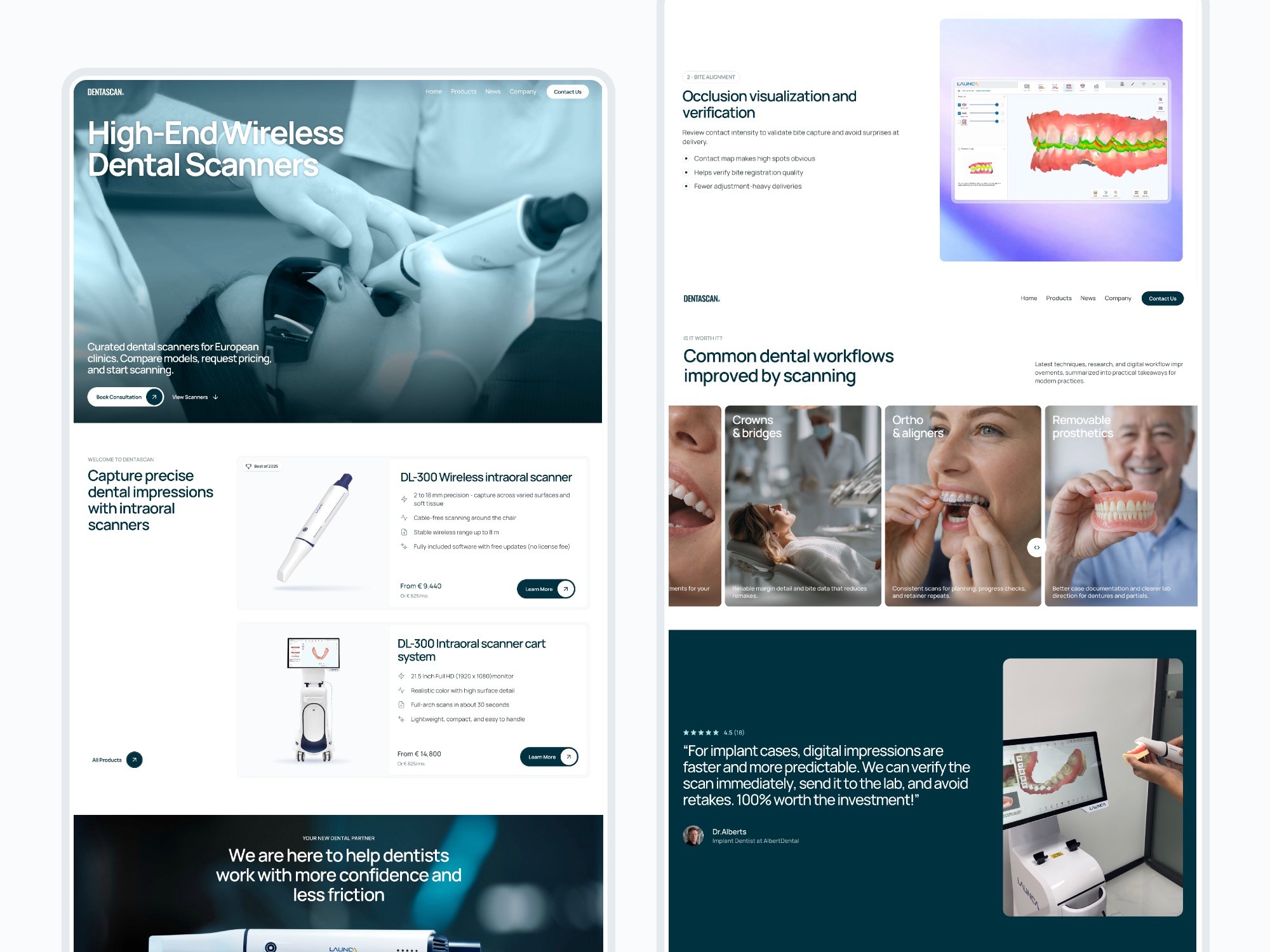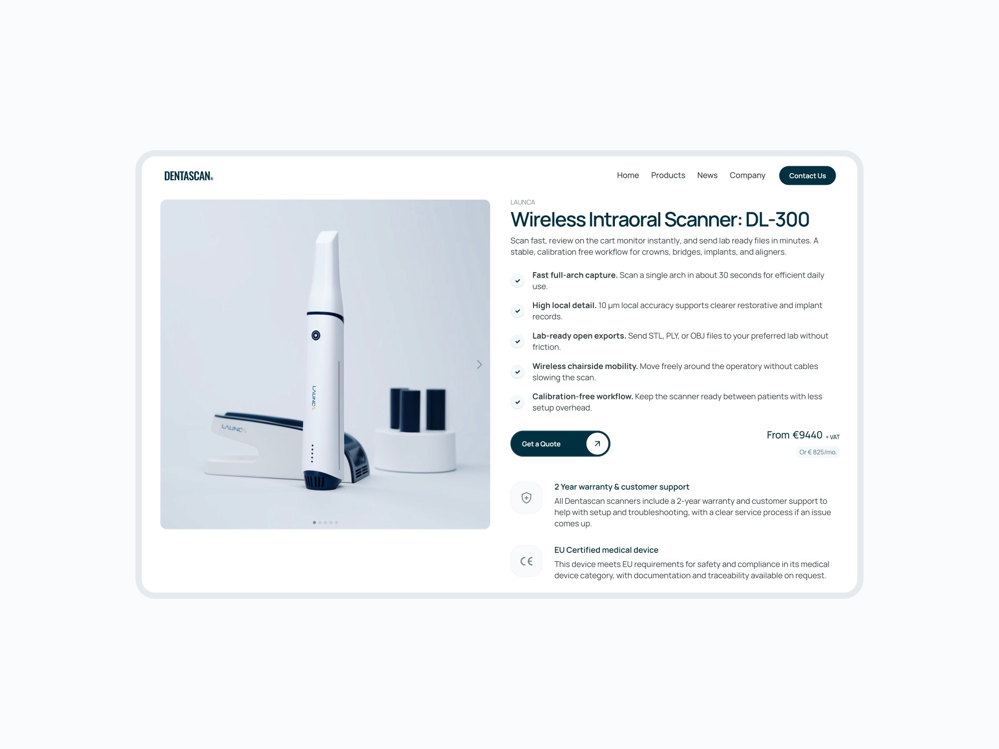 Dentascan is a European dental technology supplier helping clinics adopt modern scanners and related equipment with a workflow-first approach. For this project, we led the website design and Framer build, developed the visual brand system, and shaped the positioning and page messaging to clearly communicate trust signals (EU compliance, warranty, financing, support) while driving enquiries through a quote-first PDP flow.