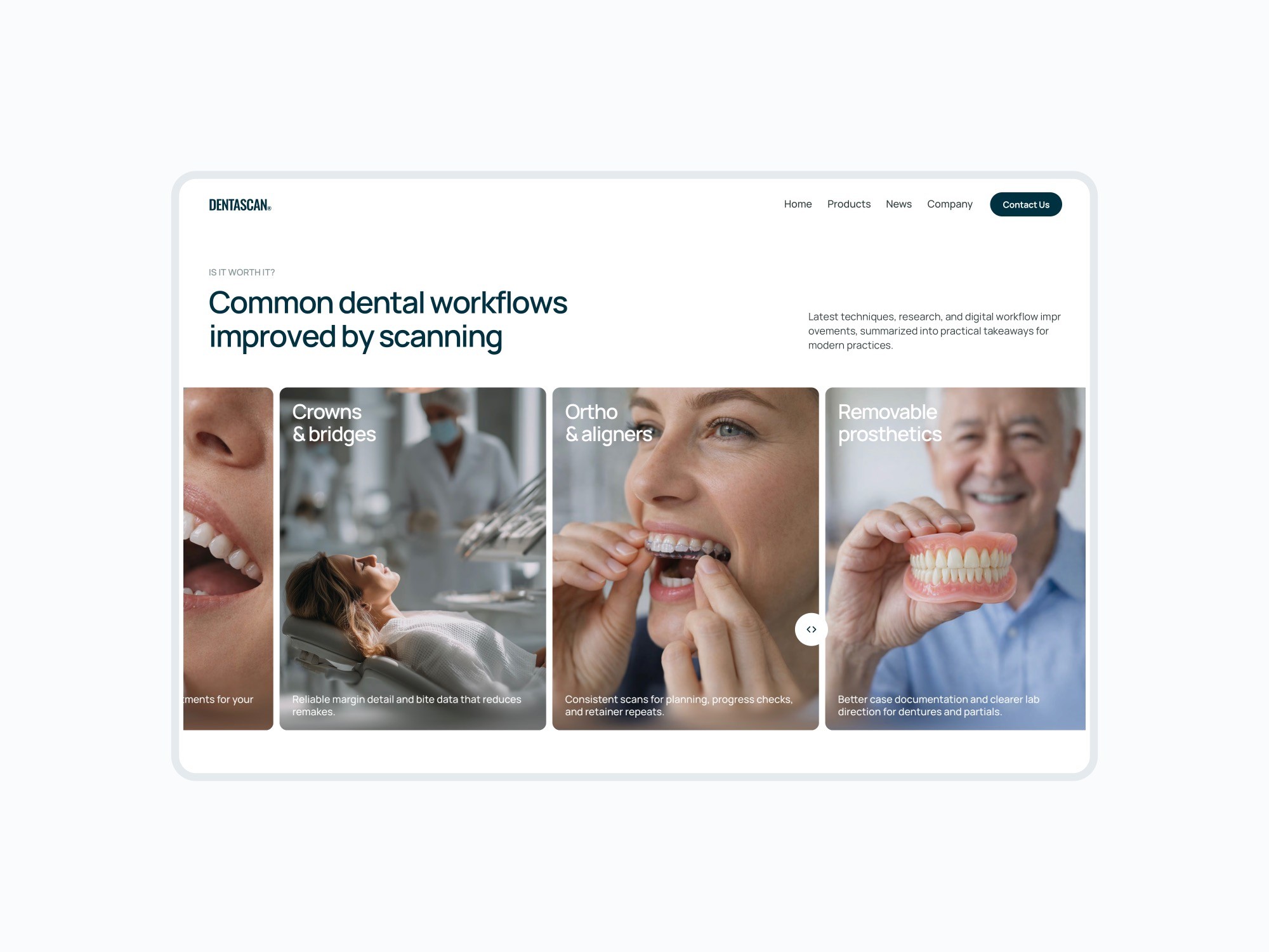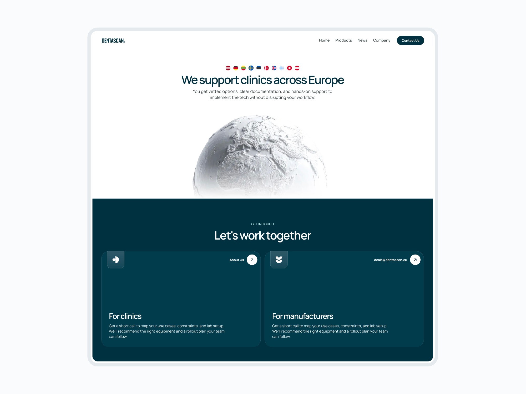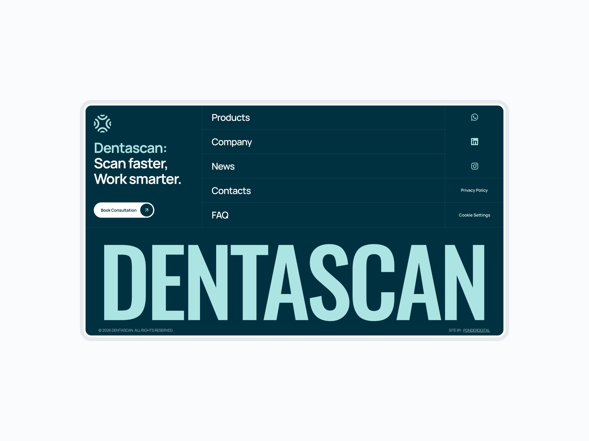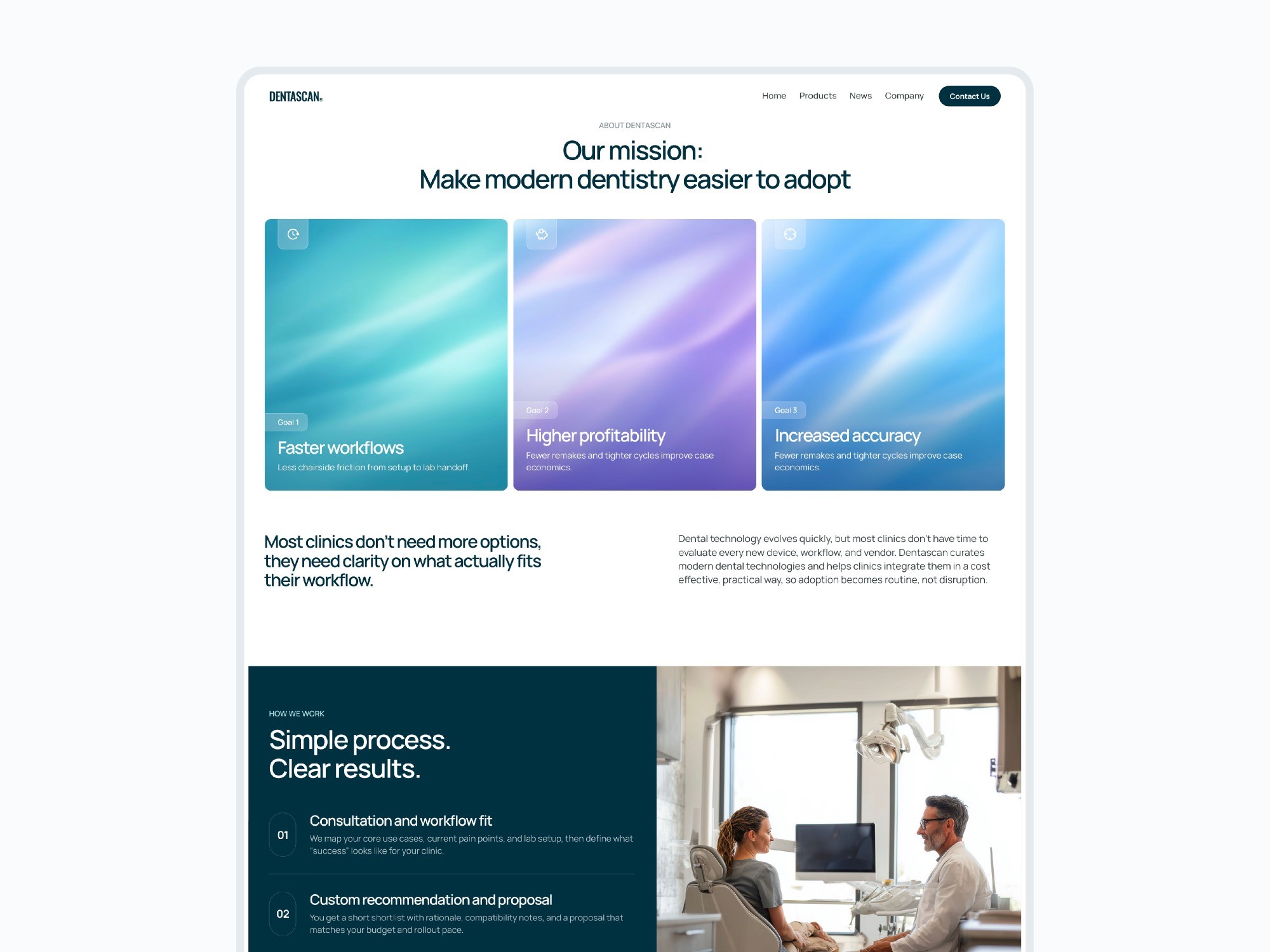 Dentascan is a European dental technology supplier helping clinics adopt modern scanners and related equipment with a workflow-first approach. For this project, we led the website design and Framer build, developed the visual brand system, and shaped the positioning and page messaging to clearly communicate trust signals (EU compliance, warranty, financing, support) while driving enquiries through a quote-first PDP flow.